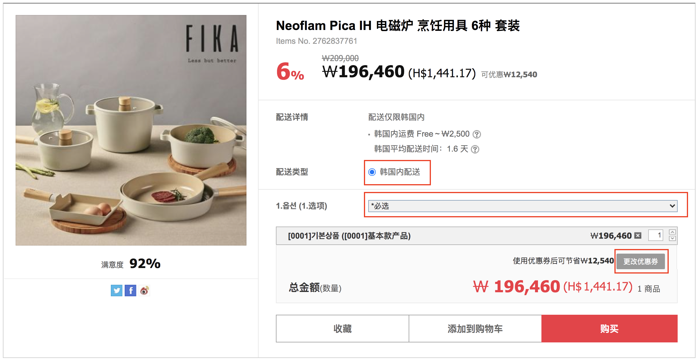 在 11st 可以善用搜尋功能尋找你想要的產品,一般產品頁面都不只有一款產品可供選購,可以在「選項」位置選你想買的產品;將產品加入購物車前亦記緊要選擇「配送類型」以及「更改優惠券」。