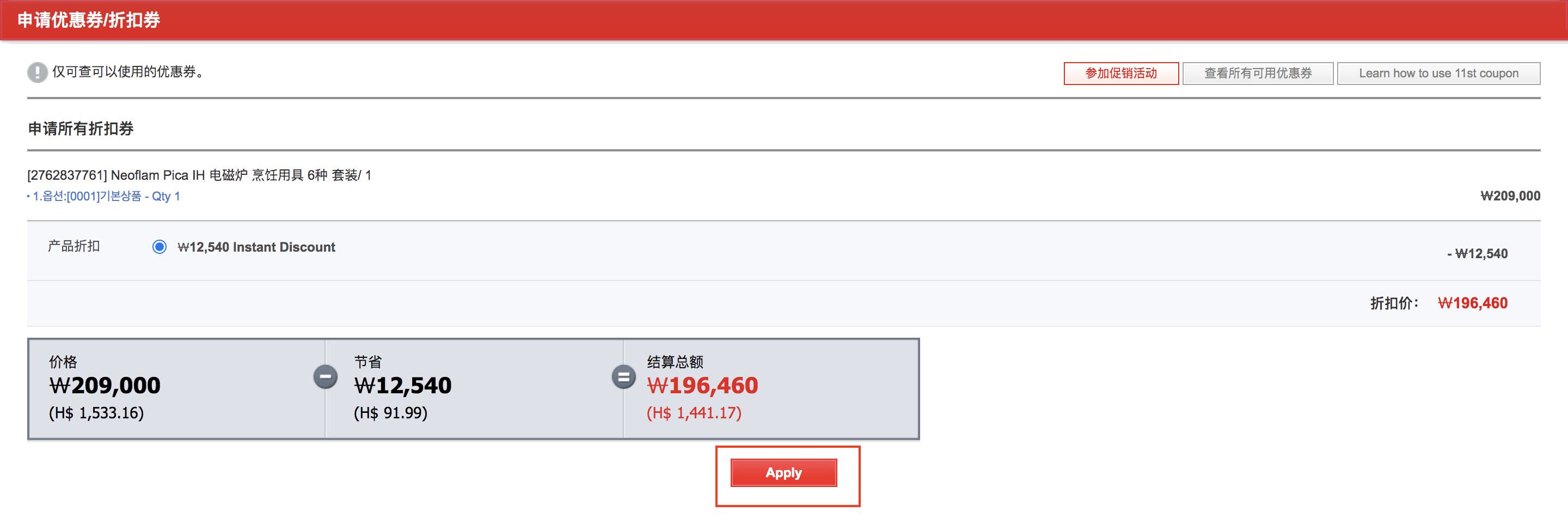由於網站未必會自動幫你選最優惠的方式,所以記得要自己再看清楚這優惠卷是否最便宜,才加入購物車。選好優惠券後點按「Apply」即可!