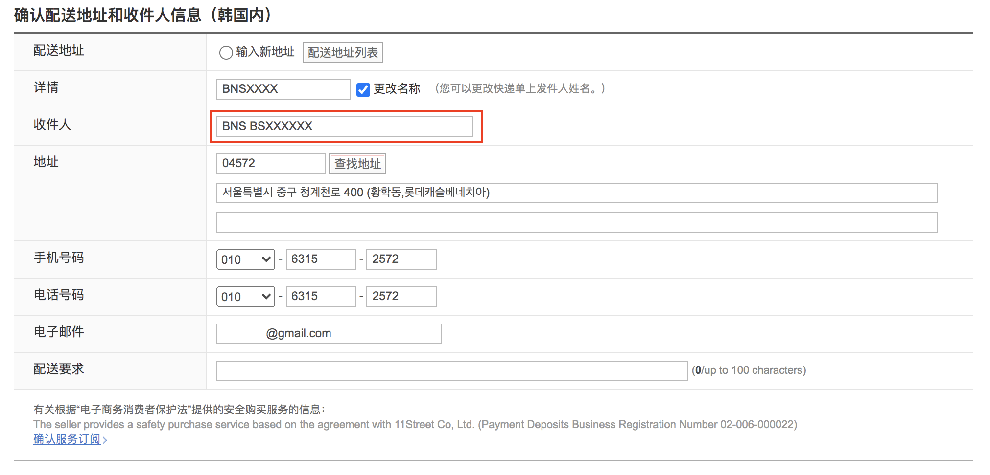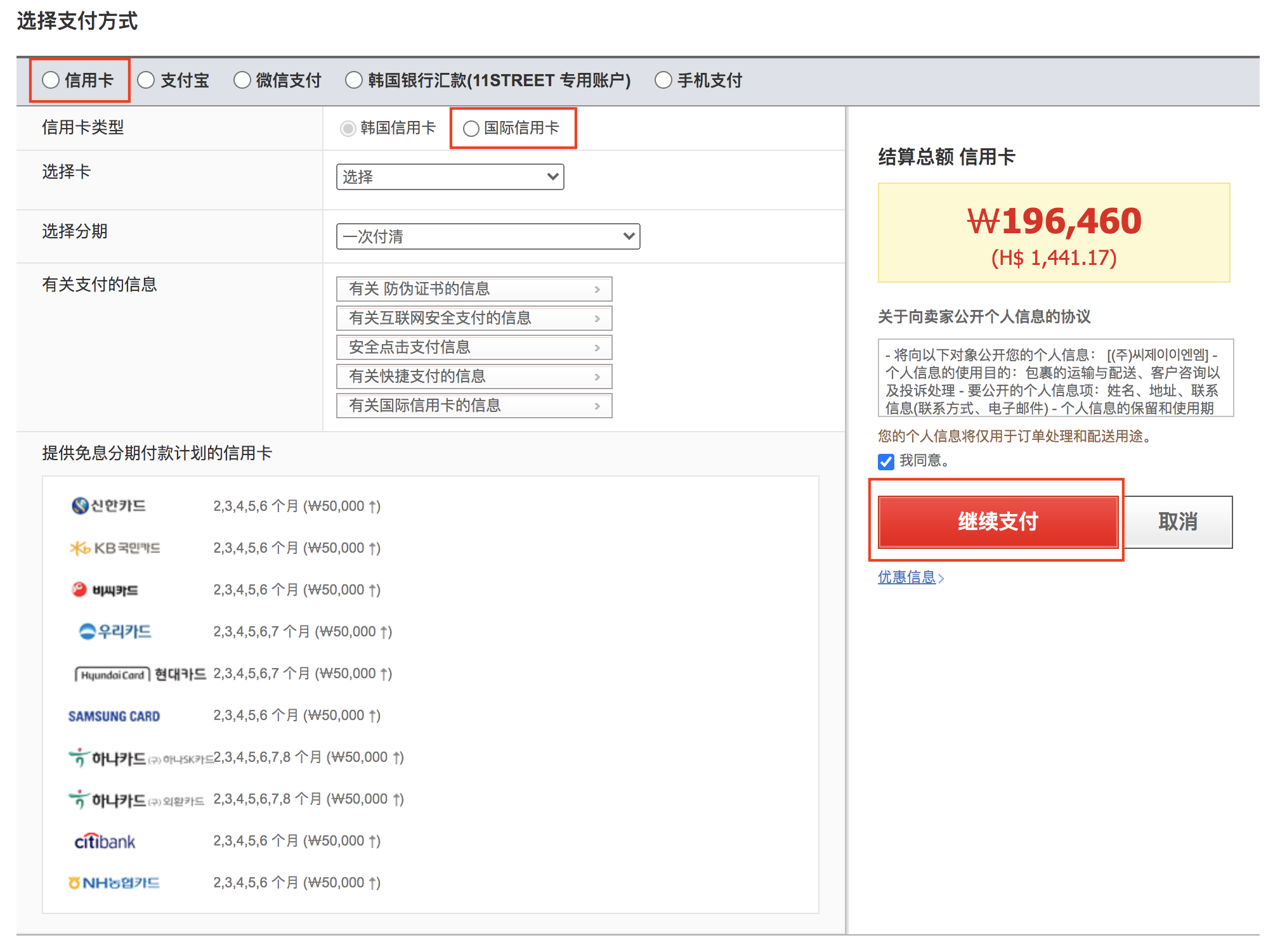 確認收件資料無誤後,就可以進行付款,11st 接受以海外信用卡作交易!記得 11st 出貨後記得要申報貨件啊~