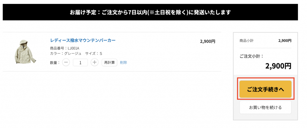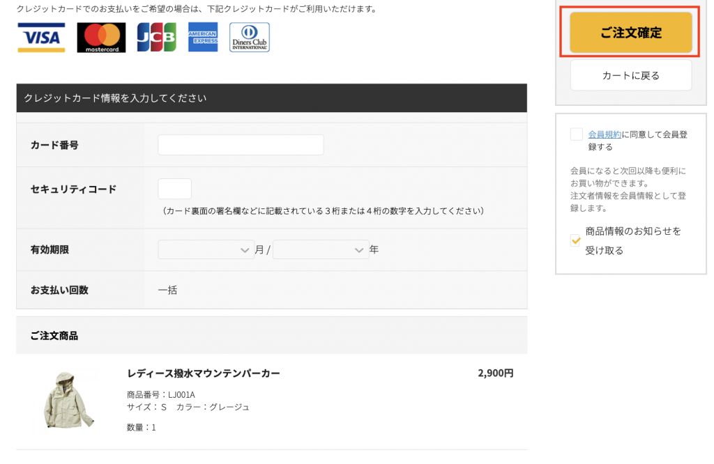 先確認訂單內容,再確認頁面上方所顯示的送貨地址及相關資料無誤,最後填寫信用卡資料結帳,再按「注文確定」。