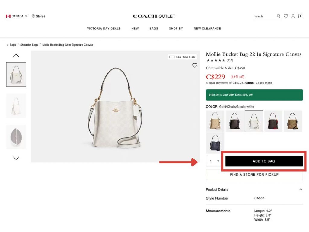 接著就可以盡情在加拿大 Coach Outlet 網站選購,將自己喜愛的商品加入購物車!
