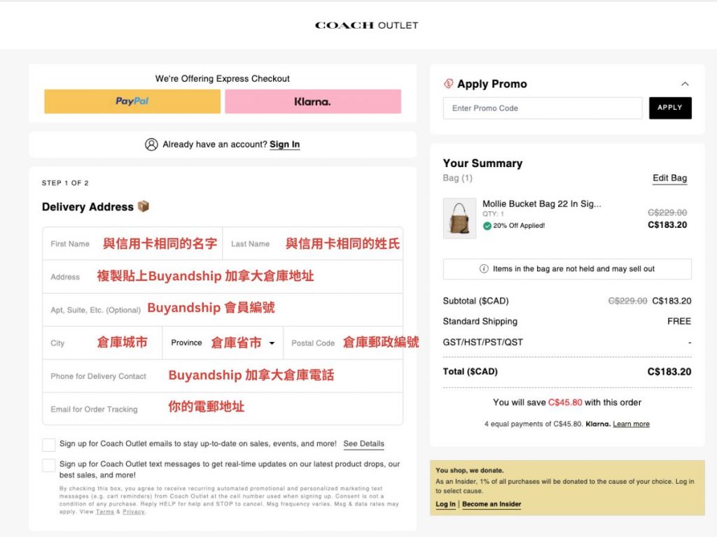 填寫寄送資料。要打開 Buy&Ship官網的「海外倉庫地址」並選擇「加拿大」,以複製貼上 Buy&Ship 加拿大倉庫的資料。